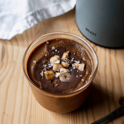 1. Gib Kokoscreme, Cashewmilch, Datteln, Vanillepaste, Haselnussbutter, Kakaopulver und Meersalz in deinen Beast-Mixbecher. Mixe alles, bis eine glatte Masse entsteht, und stelle sie beiseite.